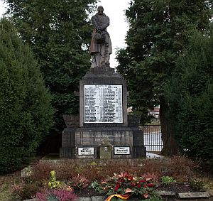 Auf einem Steinsockel, eine Stele darauf ein Soldat.