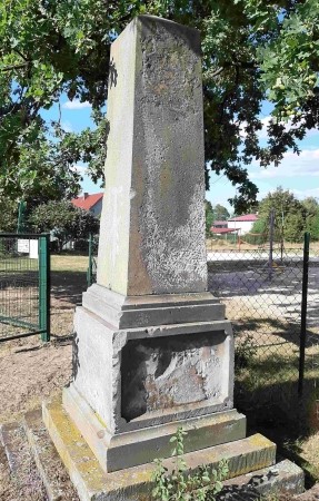 Denkmal für die Gefallenen des Ersten Weltkriegs: Abgestufter Obelisk am Rande der Dorfstraße mit entfernter Inschriftentafel.