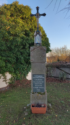 Vor einem Gehöft steht ein Bildstock aus dem Jahre 1908.