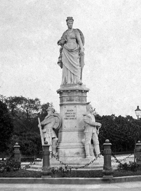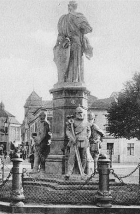 Mittig auf dem damaligen Kaiserplatz (heute Ottomar-Geschke-Platz) wurde 1887 ein Kriegerdenkmal errichtet, welches die Kriege von 1864, 1866 und den deutsch-französischen Krieg von 1870/71 verherrlichte. Dieses bestand aus einer abgestuften und verzierten Stele mit krönender Germania-Figur mit Schild. Am Fuße der Stele standen drei Soldaten-Figuren, einer mit Ulanen-Helm und zwei mit Pickelhauben, davon einer mit Bart als Landwehrmann.