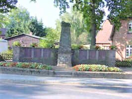 Steindenkmal mit Tafeln, in der Mitte eine Stele mit einem schlafenden Löwen und Inschrift (an der Hauptstraße).