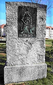 Aufgerichtete Granitplatte mit Metall-Plakette mit dem Bildnis eines Soldaten der mit einem Schwert Frau und Kind beschützt.