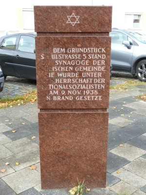Ludwigstraße / Ecke Schulstraße, Grundstück Schulstraße 5: Platz der ehemaligen Synagoge, die 1878 erbaut und am 9. November 1938 in der Pogromnacht zerstört wurde. Seit 1983 erinnert ein Gedenkstein aus rotem Granit (geschaffen vom Steinmetzbetrieb Daners & Meyer Grabmale GmbH, Wulsdorf) an das einstige Wesermünder (Geestemünder) jüdische Gotteshaus, dem auch eine jüdische Schule angeschlossen war.