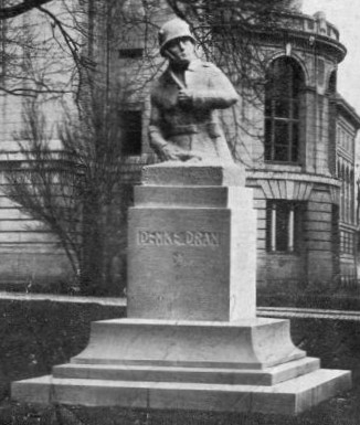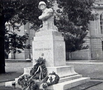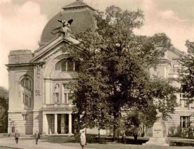 Ehemaliges Denkmal für die Gefallenen des Ersten Weltkriegs vor dem Theater der Stadt: Mehrstufiger Sockel und Quader mit daraus aufragendem Oberkörper eines Soldaten mit Stahlhelm und einer Handgranate wurfbereit in der Hand. Das Denkmal wurde nach 1945 abgerissen.