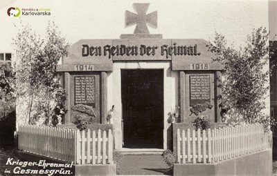 Das Denkmal für die Opfer des Ersten Weltkrieges wurde 1936 vom örtlichen Amateurtheaterverein Thalia an der Eingangswestfassade der örtlichen Marienkapelle auf dem Dorfplatz in der Mitte des Dorfes Gesmesgrün errichtet. Es wurde ein Komitee für den Bau eines Kriegerdenkmals gegründet, das vom Vorsitzenden des Theatervereins, dem örtlichen Bauern Josef Weisbach, geleitet wurde. Weitere Mitglieder waren Johann Glaser vom Gehöft Nr. 1, Franz Schneider und Wenzl Glaser sen. und jun. In vielen seiner Sitzungen führte das Komitee vorbereitende Arbeiten durch und erhielt materielle Unterstützung für das Projekt von Anwohnern und Verbänden. Durch Spenden und andere Einnahmen wurde der Betrag von 3.711 Kronen für den Bau des Denkmals gesammelt. Aus zwei Angeboten wurde die Bildhauerwerkstatt von Josef Zuber aus Gängerhof im Wert des Auftrags von 2.050 Kronen ausgewählt und mit der eigentlichen Schaffung des Denkmals betraut. Die Gesamtkosten des Denkmals beliefen sich zu dieser Zeit auf 3.561 Kronen.