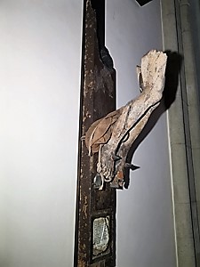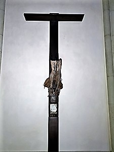 Ein Friedensmahnmal in Form eines zum großen Teil verbrannten Kruzifixes erinnert an die Bombennacht vom 24. auf den 25. April 1944 in München Au.