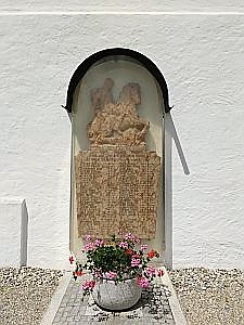 In der Außenwand der Kirche St. Stephanus eine Gedenkplatte mit einer Figur des Hl. Georg.