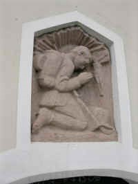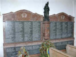 Kriegergedächtniskapelle: Über der Tür zur Kapelle ist das Relief eines betenden Weltkriegssoldaten zu sehen. An der Nordwand des Kirchenraumes hängen Gedenktafeln mit den 87 bzw. 236 Namen der Gefallenen und Vermissten der beiden Weltkriege.