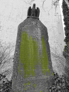 Denkmal für die Gefallenen des 1. Weltkriegs vor der Kirche. Aufgerichteter Felsblock mit krönendem Adler.