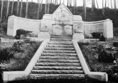 Ehemaliges Denkmal für die Gefallenen des Ersten Weltkriegs an einem Berghang: Treppenaufgang zu einer halbrunden Wand, die in der Mitte von einem spitz zulaufenden Aufsatz gekrönt wurde. Dort war ein Relief eingearbeitet, das einen weiblichen Engel zeigt, der seine Arme über Grabkreuze ausbreitet. Das Denkmal verschwand wahrscheinlich nach 1945.