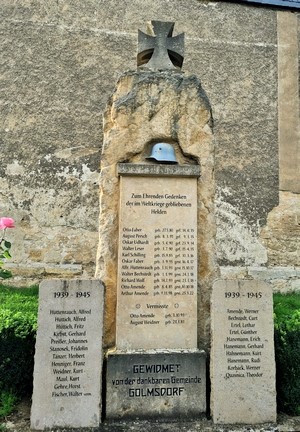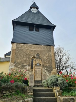 Unmittelbar vor der Kirche befindet sich das Denkmal, das 1923 errichtet wurde. Es bestand ursprünglich aus einer Sandsteinstele mit den Namen der im Ersten Weltkrieg gefallenen Einwohner des Ortes. Auf dem oberen Abschluss der Stele steht ein aus Sandstein plastisch geformtes Eisernes Kreuz. Drei Stufen führen zum Denkmal. Das Denkmal wurde 2011 restauriert und Tafeln auf gesonderten Steinen links und rechts neben dem Denkmal mit den Namen der Gefallenen des Zweiten Weltkrieges hinzugefügt. Dazu fand am 13. November 2011, dem Volkstrauertag, eine Veranstaltung statt. Dabei übergab der Vorsitzende des Vereins der Hobbywinzer und Heimatfreunde, Michael Köcher, das Denkmal.