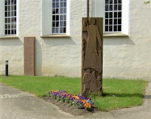 Steintafel an der Kirchenwand mit den Namen der Gefallenen des Ersten Weltkriegs: Vorne eine Frau mit Lanze im Kampf gegen einen Drachenkopf und Schlange.
