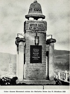 Auf dem Friedhof wurde zur Mahnung und Erinnerung an diesen schmerzlichen Tag ein Denkmal errichtet, das symbolisch die "Sturmglocke” der Graslitzer Dekanalkirche darstellte. Unter dem Gedenkstein ruhten die 15 Toten des 27. Oktobers 1921 und Wandtafeln trugen ihre Namen. Das damalige „Sturmläuten” hatte die Bevölkerung auf die Straßen gerufen. Sie wollte in Ruhe und Ordnung für das versprochene Selbstbestimmungsrecht demonstrieren. Wenn auch die Tschechen nach dem Zusammenbruch des Zweiten Weltkrieges, infolge ihrer wiedererstandenen Macht, dieses Ehrenmal von deutschen Männern abtragen ließ; "wir dürfen diese Toten nicht vergessen!”