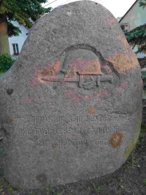 Denkmal für die Gefallenen des Ersten Weltkriegs vor der Kirche: Großer Findling mit Gravuren. Vorderseite mit EK-Zeichen mit Eichenlaub, Widmung und den Namen. Rückseite mit Stahlhelm und christlichem Spruch (Inschriften schwer lesbar).