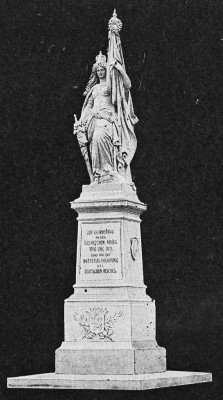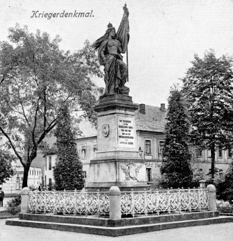 Ehemaliges Denkmal für die Gefallenen des Krieges 1870/71 auf dem Heinrichsplatz: Abgestufte Stele mit Widmungs- und Namenstafeln, darauf die Figur einer Germania mit Fahne und Schwert in den Händen. Das Denkmal wurde nach 1945 abgerissen.