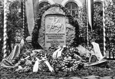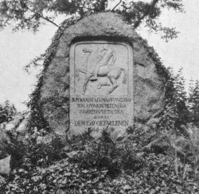 Der Anfang der Inschrift auf dem Denkmal ist in Lateinisch und durch schlechte Lesbarkeit auf den beiden vorliegenden Fotos und mangels Lateinkenntnisse des Verfassers nicht zu entziffern. In der Schule waren Gedenktafeln angebracht mit den Namen der 159 Gefallenen. Ob diese noch in einem Lager oder Keller existieren ist unbekannt.
