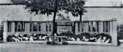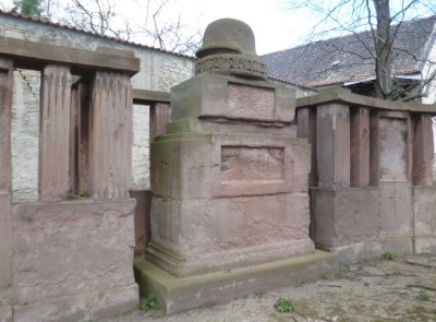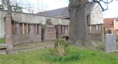 Ehemaliges Denkmal für die Gefallenen des Ersten Weltkriegs auf dem Dorfplatz: Hinter einer mächtigen Eiche eine halbrunde Mauer mit Säulen, Durchbrüchen und breiteren Flächen für Namenstafeln. In der Mitte ein Quader mit Widmungstafeln und der krönenden Figur eines nackten sterbenden Kriegers.