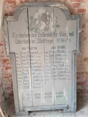 Im Turm der Kirche von Groß Machmin befindet sich eine Gedenktafel für die Gefallenen des Ersten Weltkriegs aus Karzin und Bedlin.