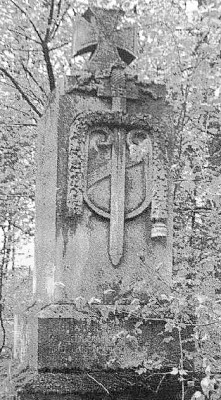 Denkmal für die Gefallenen des Ersten Weltkriegs: Zweistufiger Sockel und aufgesetzter Quader mit Relief von Schwert, Schild und Eichenlaub, gekrönt von einem EK-Zeichen.
