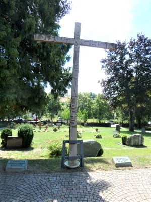 Friedhof: Zwei Denkmäler einige Meter östlich der 1957 erbauten Aussegnungshalle und nahe dem Kriegerdenkmal für die Teilnehmer und Gefallenen des Krieges 1870/71.