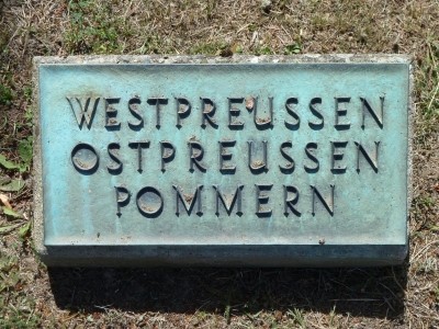 auch zwei liegende Metallplatten links und rechts des Holzkreuzes mit den Namen dieser Ostgebiete,
