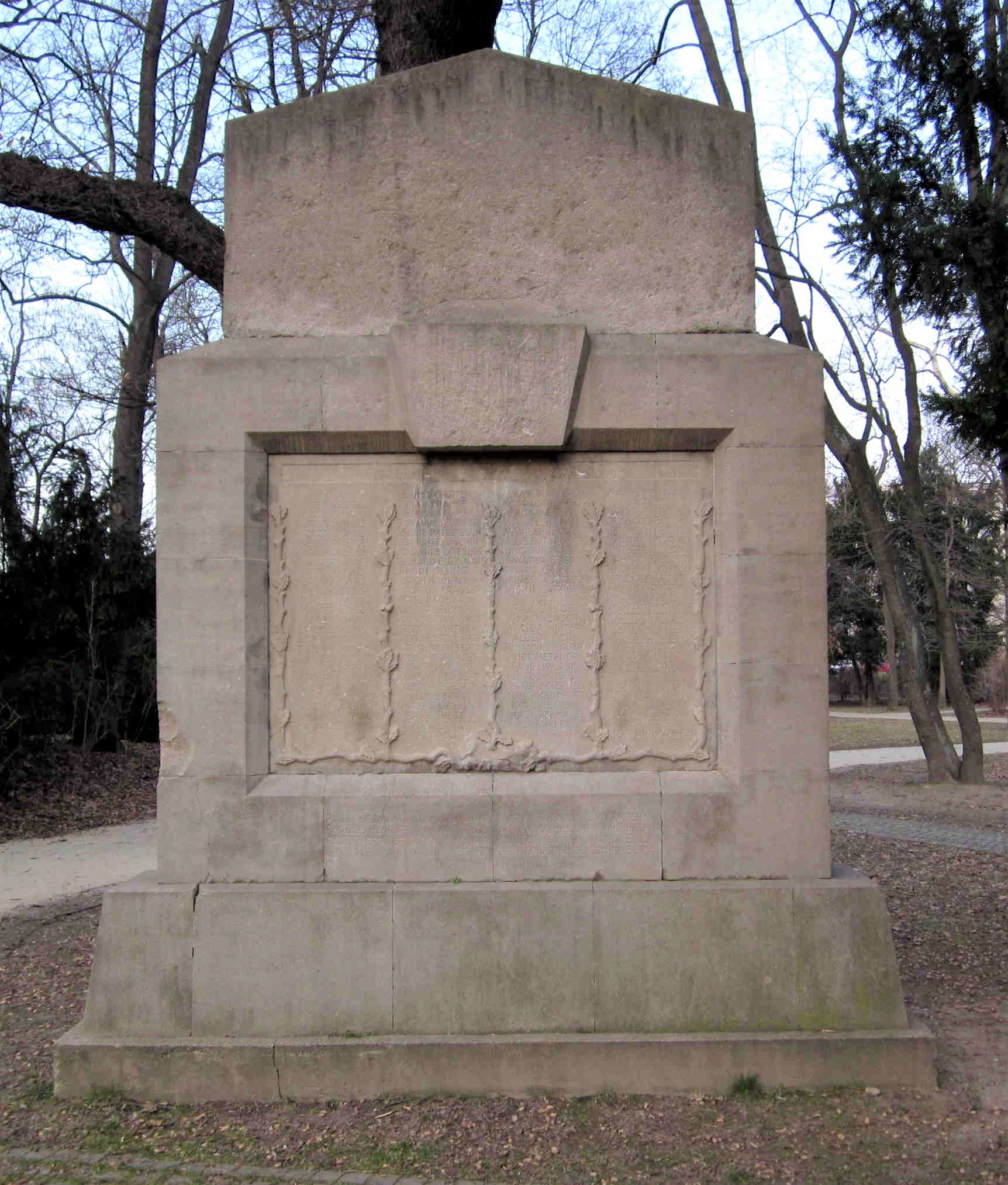 Denkmal für die Gefallenen des Ersten Weltkriegs im Rothermundt-Park: Auf einen Sockel befindliche Steinplatte mit vertiefter Namenstafel und einem nach oben spitz zulaufendem Aufsatz.