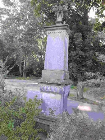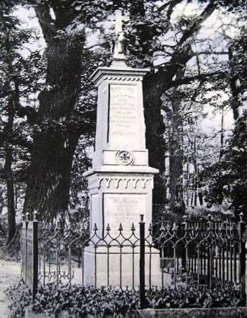 Denkmal für die Gefallenen des Krieges 1870/71 vor dem Friedhof. Abgestufte verzierte Stele mit fehlenden, beschädigten und übertünchten Namenstafeln.