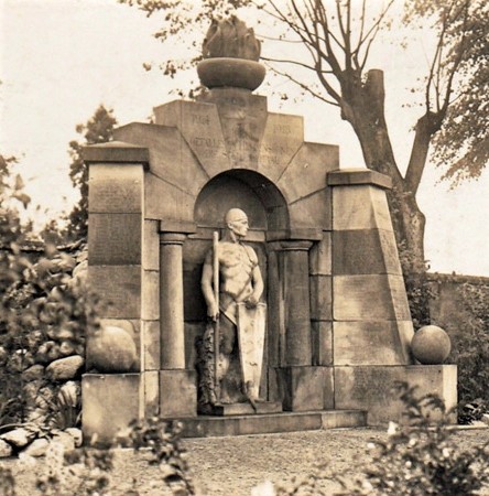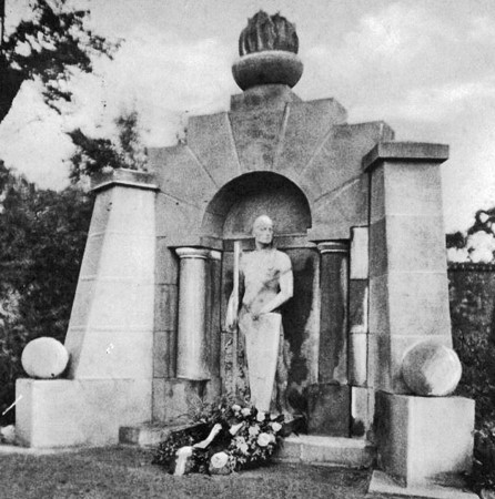 Denkmal für die Gefallenen des Ersten Weltkriegs.: Tempelartige Eckwand aus Steinblöcken mit überdachter Kriegerfigur mit Schild und Speer und krönender Flammenschale (komplett abgerissen).