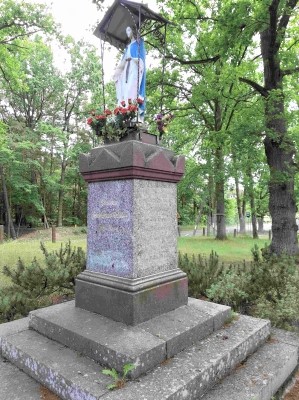 Denkmal für die Gefallenen des Ersten Weltkriegs im Kirchhof von Guschterholländer. Die Widmung oder Inschrift des Denkmals wurde unkenntlich gemacht. Die Auflistung der Gefallenen ist jedoch gut lesbar. Bekrönt ist das Denkmal heute mit einer Marienfigur.