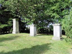 Auf dem rechten Teil des Friedhofes, links hinter dem Soldatenfriedhof: Drei quadratische Säulen mit kleinem Dach.