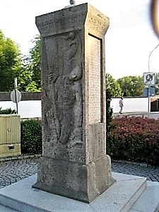 Steinstele mit aufgesetztem deutschen Kreuz. An zwei Seiten sind Gedenkplatten eingefügt
