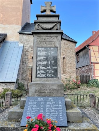 Davor eine schrägliegende Tafel mit den Namen der Gefallenen des Zweiten Weltkriegs.