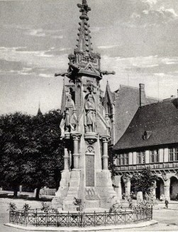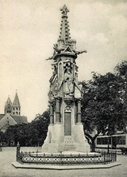 Ehemaliges Denkmal für die Gefallenen des Krieges 1870/71 auf dem Domplatz: Sehr reich verzierte Stele mit unten eingelassenen Widmungs- und Namenstafeln, flankiert von Säulen, darüber Figuren der Kaiser Wilhelm I., Friedrich I. Barbarossa, Karl dem Großen und Heinrich I. Die ebenfalls reich verzierte Spitze wurde von einer Kreuzblume gekrönt. Das Denkmal wurde nach 1945 abgerissen.