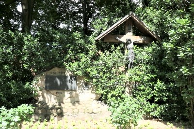 Auf einer Bronzetafel die Namen der Gefallenen. Daneben ein Kreuz aus wuchtigen Eichenbalken mit einem bronzenen Corpus.