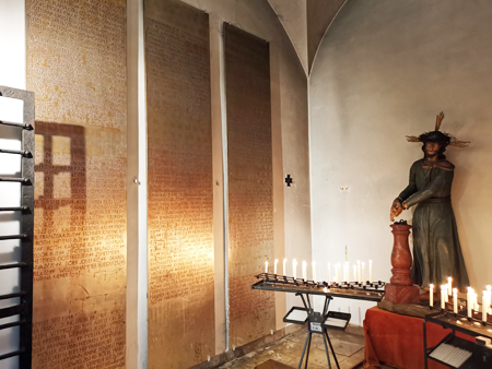 Drei vergoldete Holztafeln nennen sowohl Namen von Soldaten als auch von Zivilisten, die durch Bombardierungen zu Tode kamen.