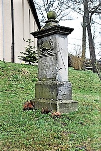 Vor der Kirche steht ein ca. 1,5 m hoher heller Stein. Die Vorderseite zeigt oben das Relief einer Pickelhaube.