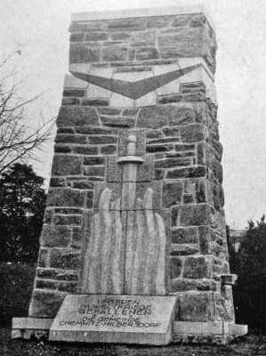 Das historische Foto entstammt dem Buch „Deutscher Ehrenhain für die Helden von 1914/18“ im Dehain Verlag, Leipzig 1931. Dort ist vermerkt, dass das Denkmal vom Architekten W. Müller aus Chemnitz entworfen wurde. Das Schwert in den Flammen ist nach 1945 herausgemeißelt worden.
