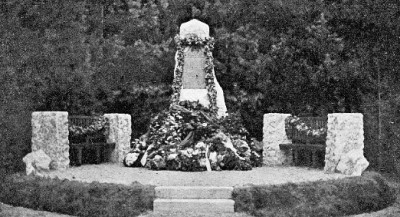 Ehemaliges Denkmal für die Gefallenen des Gymnasial-Turnvereins Georgiana am Römersbach: Aufgerichteter Felsblock mit angebrachter Widmungs- und Namenstafel, flankiert von vier niedrigen Steinblöcken mit Ruhebänken. Das Denkmal wurde nach 1945 abgerissen.