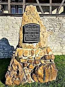 und einem darüber stehenden grob behauenem Felsblock. Dieser trägt eine Tafel, auf der die Opfer des Ersten und Zweiten Weltkrieges verzeichnet sind.