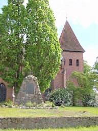 Eine Pyramide aus Feldsteinen vor der Kirche, Tafeln mit den Namen der Opfer beider Weltkriege.