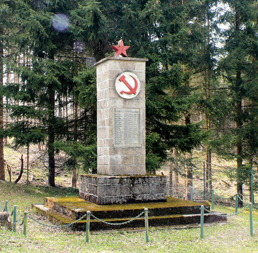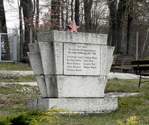 Denkmalstele mit krönendem Sowjetstern und Hammer und Sichel Symbol für 32 russische Kriegsgefangene des 2. Weltkriegs.