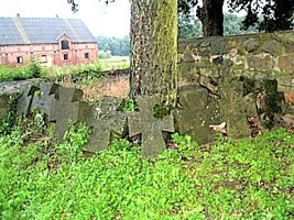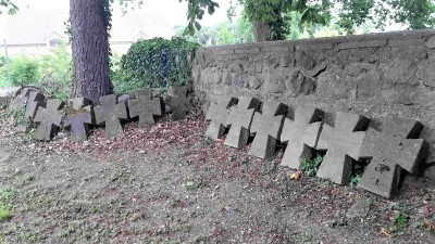 Die Kreuze waren bis 1945 vor einem großen Findling mit Widmung aufgestellt. Nach 1945 wurden die Kreuze an der Kirchenmauer abgestellt und der große Findling verschwand. Dessen Widmung ist unbekannt.