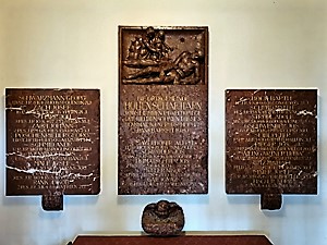 Drei Namenstafeln für Gefallene des Ersten Weltkrieges. Zwei Namenstafeln zum Zweiten Weltkrieg. Beide sind aus rotem Stein (Marmor/Porphyr?) gefertigt.