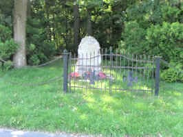 Auf dem Weg zur Kirche ein von einem Zaun mit Eisernem Kreuz umgebener Findling mit nahezu unleserlicher Aufschrift für den Krieg 1870/71.