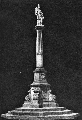 Ehemaliges Sieges-Denkmal des Krieges 1870/71: Quader mit vier kleinen geschwungenen Seitenflügeln, darauf eine klassische Säule mit krönender Figur einer Germania mit Schild. Das Denkmal verschwand nach 1945.