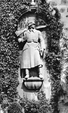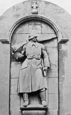 Ehemaliges Denkmal für die Gefallenen des Ersten Weltkriegs, angebracht am Kirchturm der St. Jakobus Kirche: In einer Nische eingearbeitet die Figur eines Soldaten mit Mantel und Stahlhelm, der sein Gewehr quer geschultert und eine Granate in der anderen Hand hält. Das Denkmal wurde nach 1945 abgerissen.