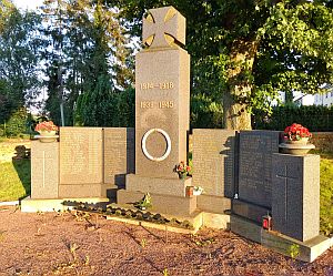 Steinstele mit Deutschem Kreuz. Daran sind vier Gedenkplatten angefügt, die von zwei kleinen Stelen gestützt werden.