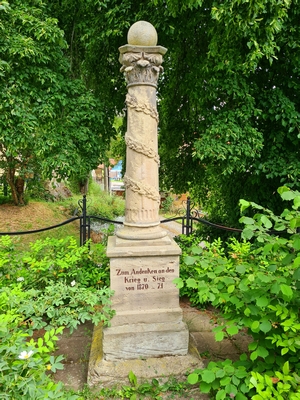 die mit einer Girlande aus Lorbeer- und Eichenlaub umwunden ist. Als Architrav liegt eine Kugel, die entweder eine Kanonenkugel oder die Weltkugel darstellt.