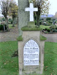 Auf dem Friedhof Gedenkstein für die Kriegsopfer von 1870/71. Eingelegte weiße Marmorplatte mit Inschrift, aufgesetztes weißes Kreuz.