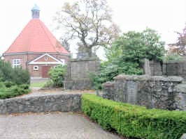 Ehrenmal für die Kriegstoten beider Weltkriege. Für 1914-1918 ein Findling mit glatter Vorderseite und 33 Namen, eingefasst in eine Natursteinmauer.